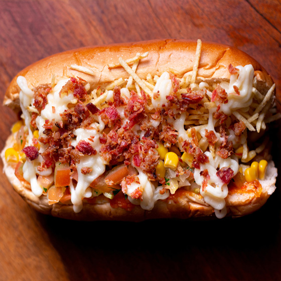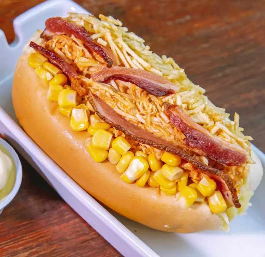 Pão, Salsicha, bacon, queijo, frango, milho e batata palha